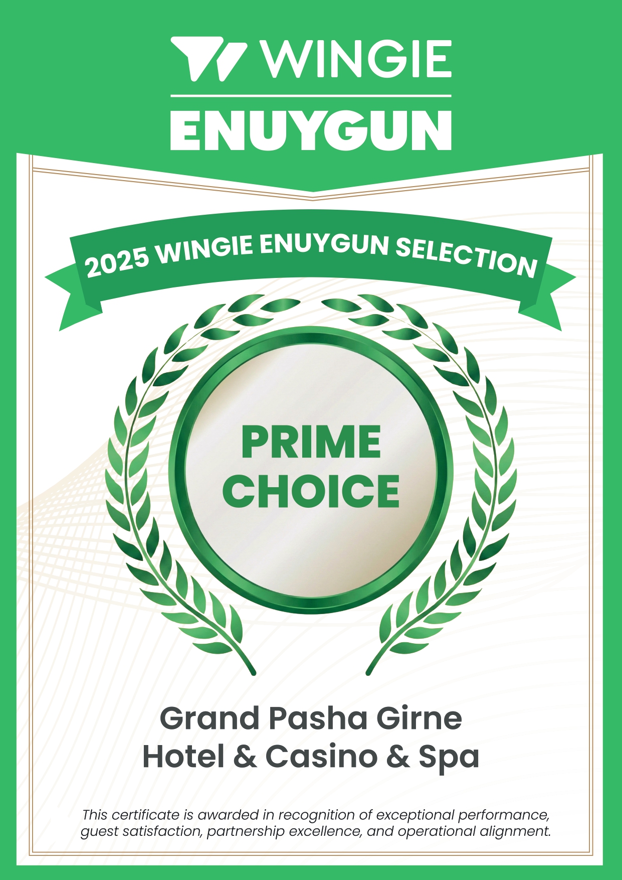 Grand Pasha Girne Hotel & Casino & Spa, uluslararası seyahat platformu Wingie tarafından verilen “2025 Wingie Enuygun Selection – Prime Choice” ödülüne layık görüldü.