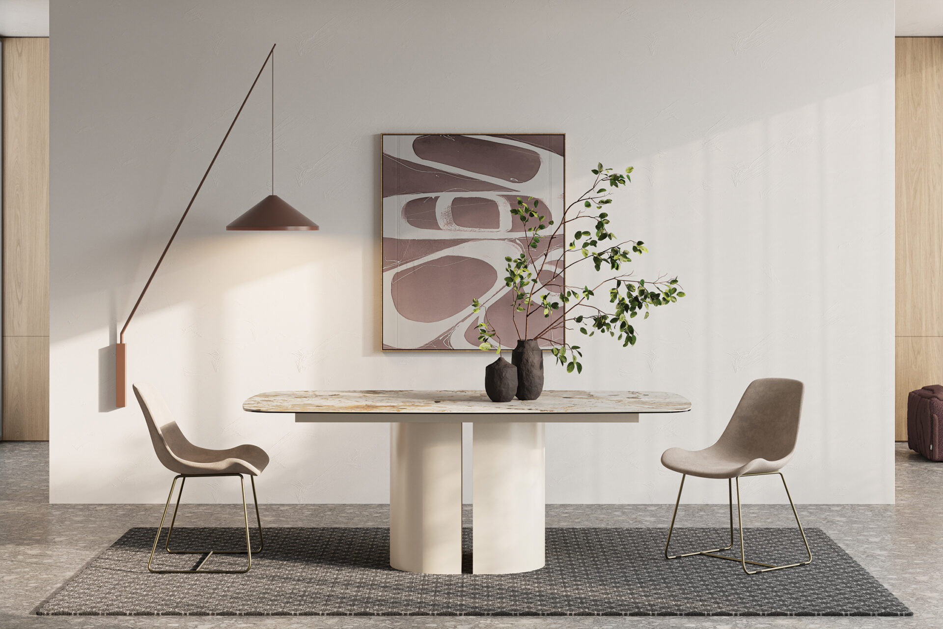 Minimal çizgiler, dengeli oranlar ve özenle seçilmiş malzemeler koleksiyonun tasarım felsefesinin merkezinde yer alıyor. Camın şeffaflığı, metalin güçlü karakteri ve doğal yüzeylerin sıcak dokusu bir araya gelerek mekân içinde sade ama etkileyici bir görsel bütünlük yaratıyor.